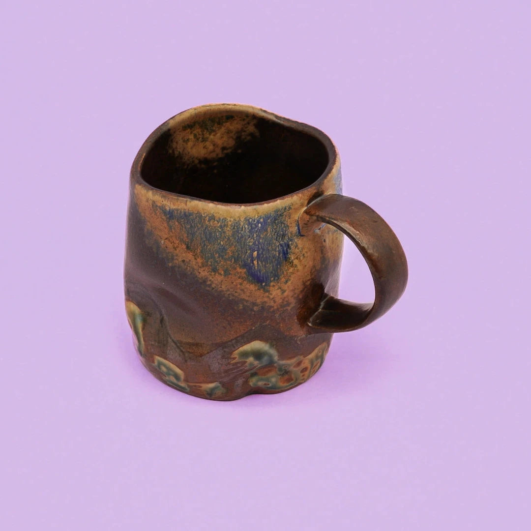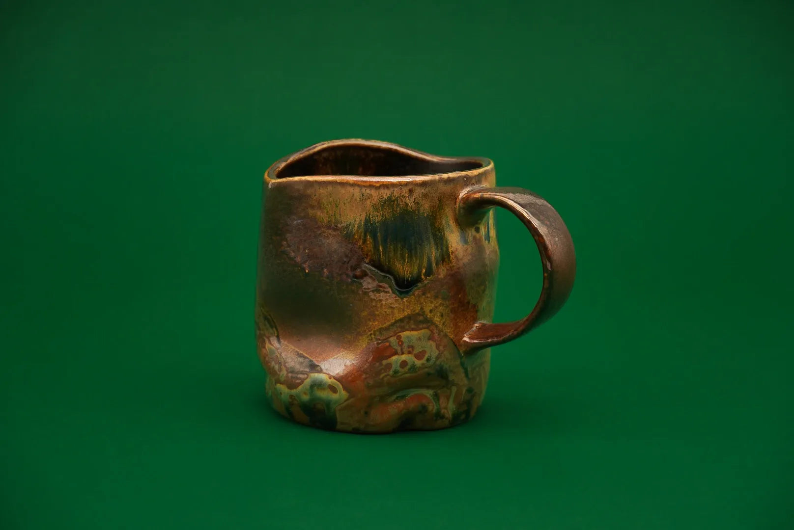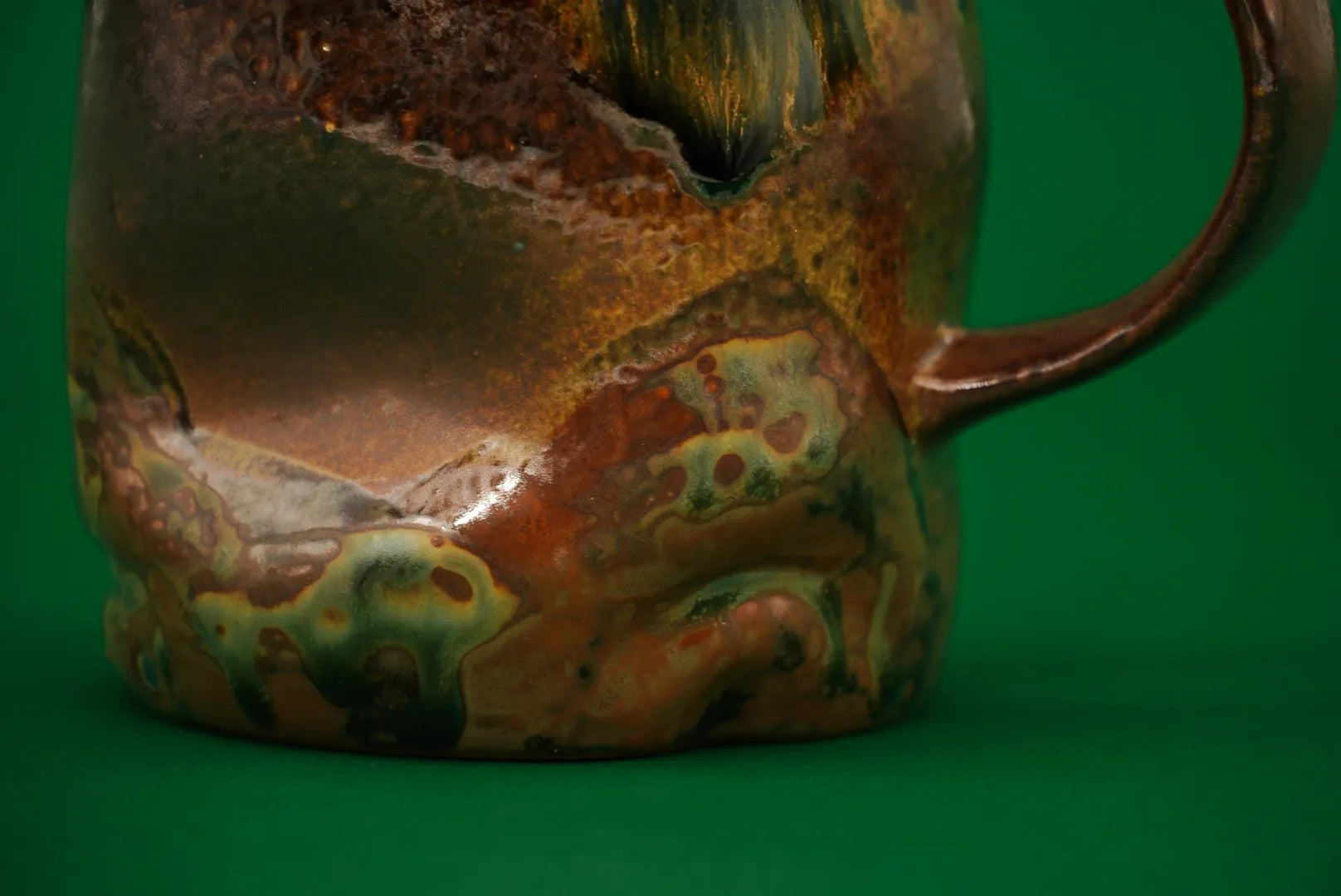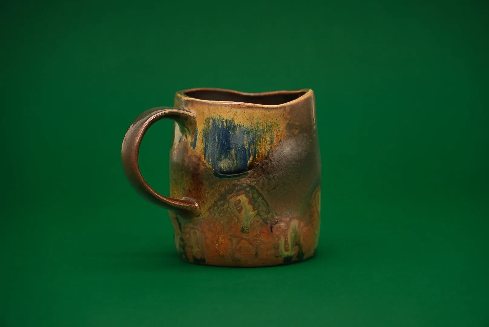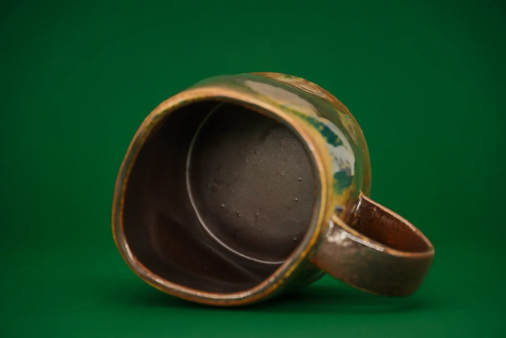 Tai rankų darbo puodelis, kurio spalvos primena rudens mišką. Čia susilieja šilti rudi, žalsvi ir auksiniai tonai. Viršuje tamsesnė žalia primena samanas bei miško šešėlį, o apačioje vario ir molio atspalviai, kurie sukuria gyvą, natūralų raštą. Tai ne tik indas, bet ir stilingas namų aksesuaras.