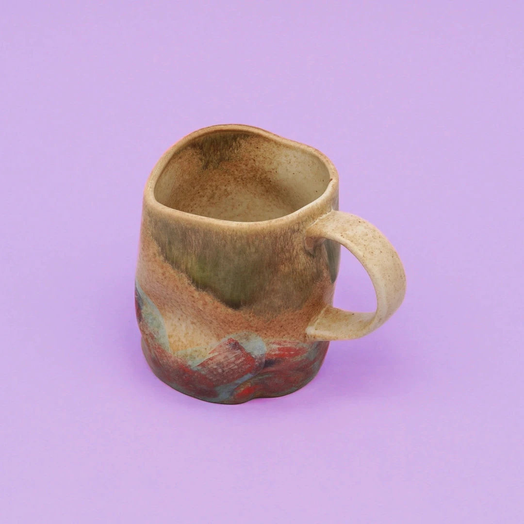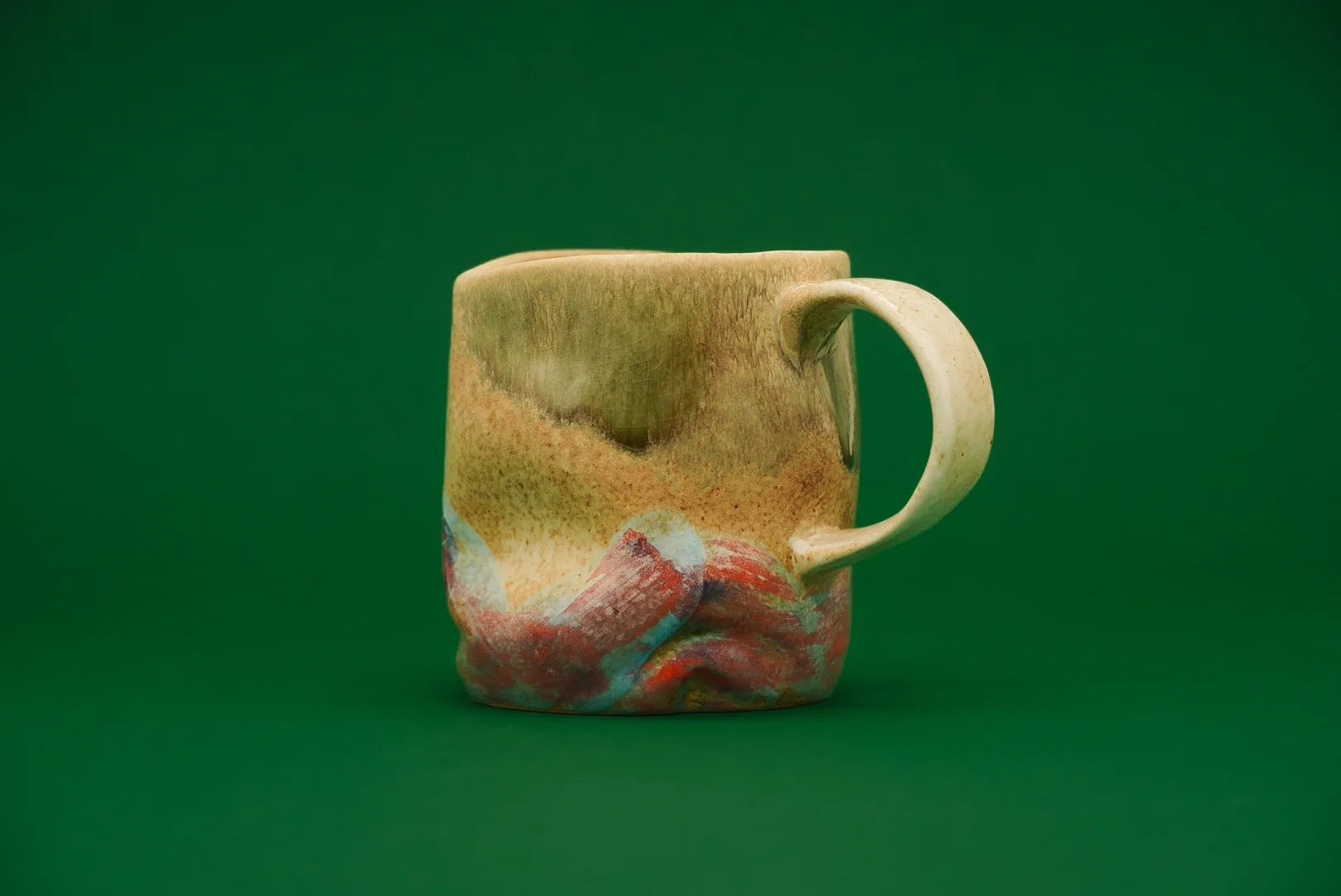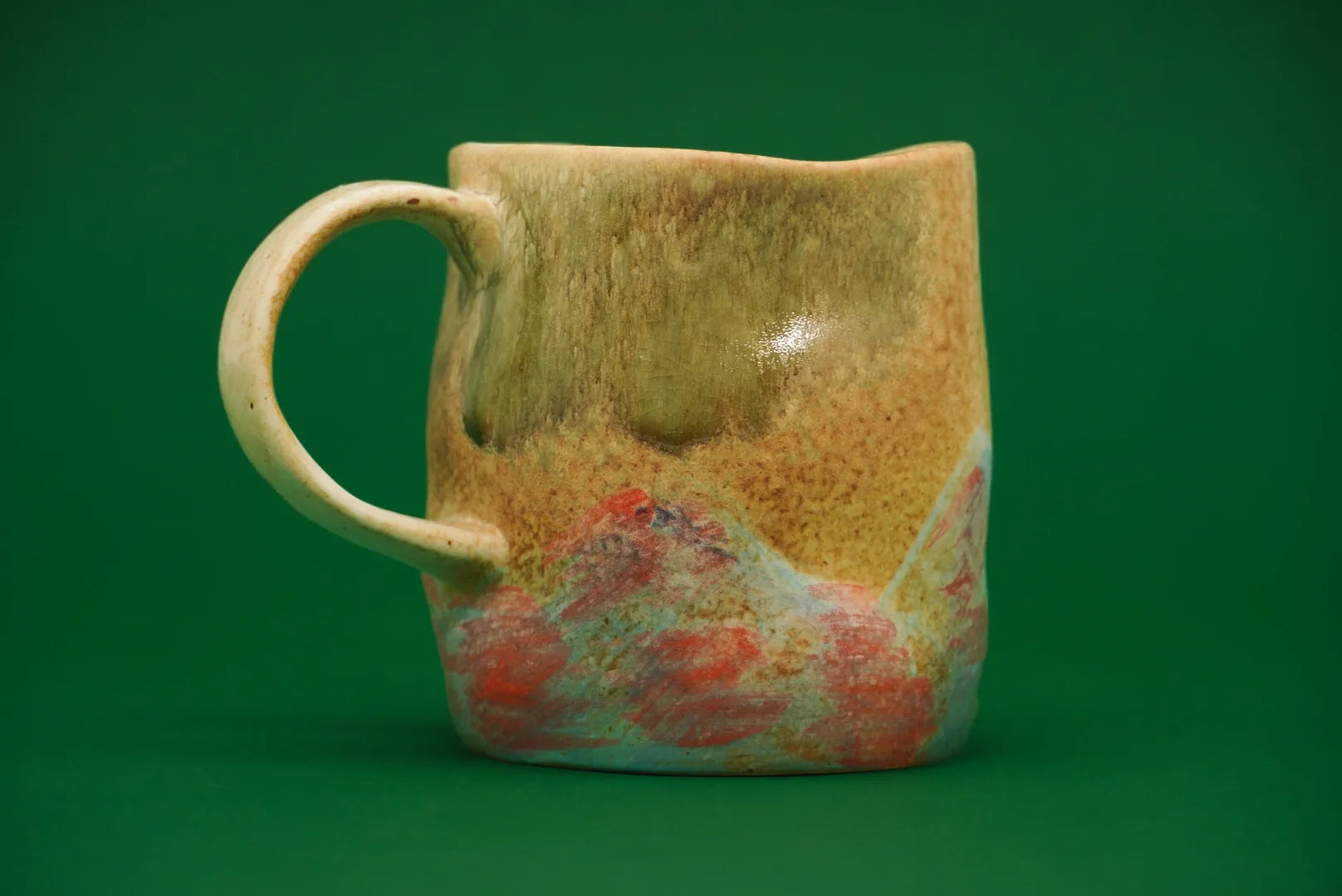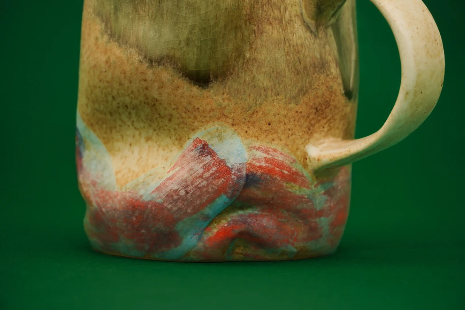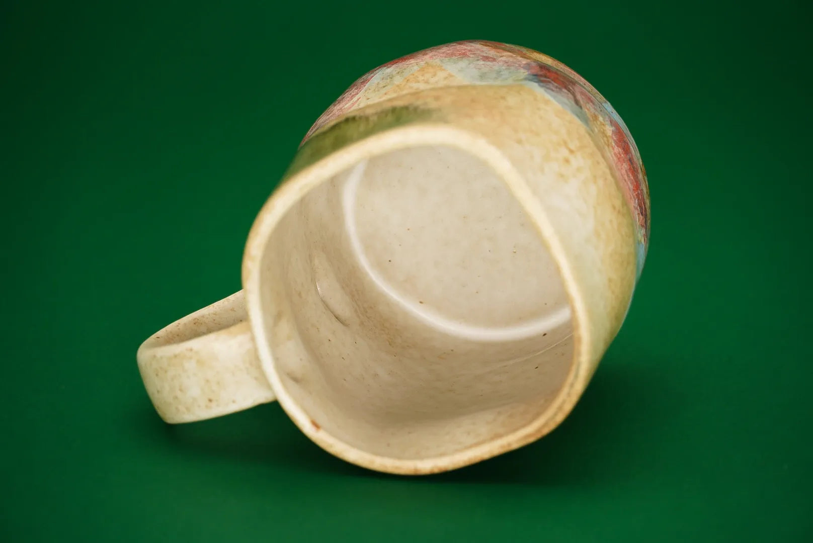 Puodelio spalvos primena saulėtą peizažą. Šiltas smėlio tonas pereina į žalsvai gelsvą, o apačioje žaidžia minkšti rausvi ir melsvi potėpiai. Šie spalviniai perėjimai atrodo tarsi nutapyti akvarele, sukuria ramų, svajingą įspūdį. Paviršius šiek tiek blizga, todėl šviesa ant jo žaidžia subtiliai ir švelniai. Puikiai tinka tiems, kurie vertina daiktus su istorija, šiluma ir autentiškumu.
