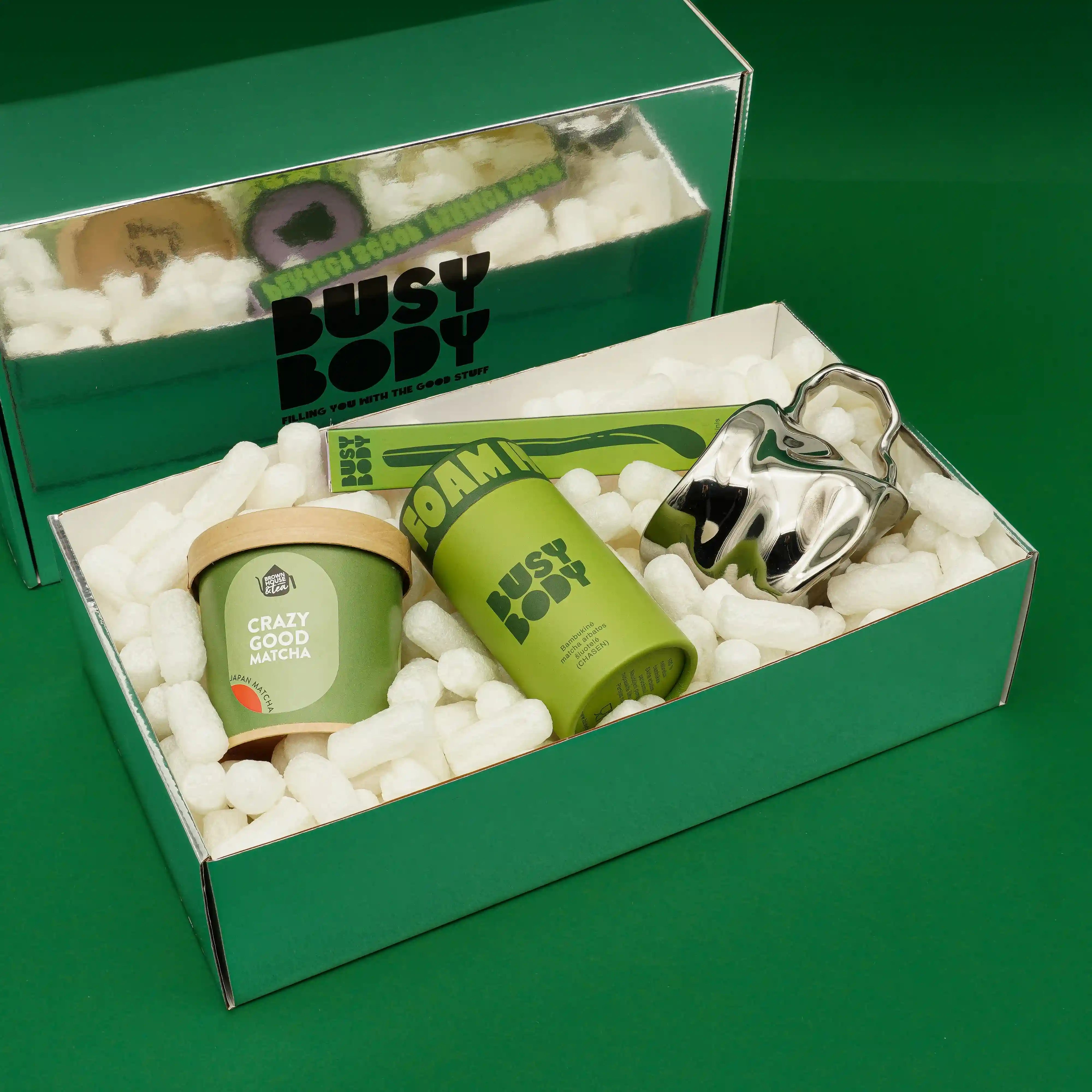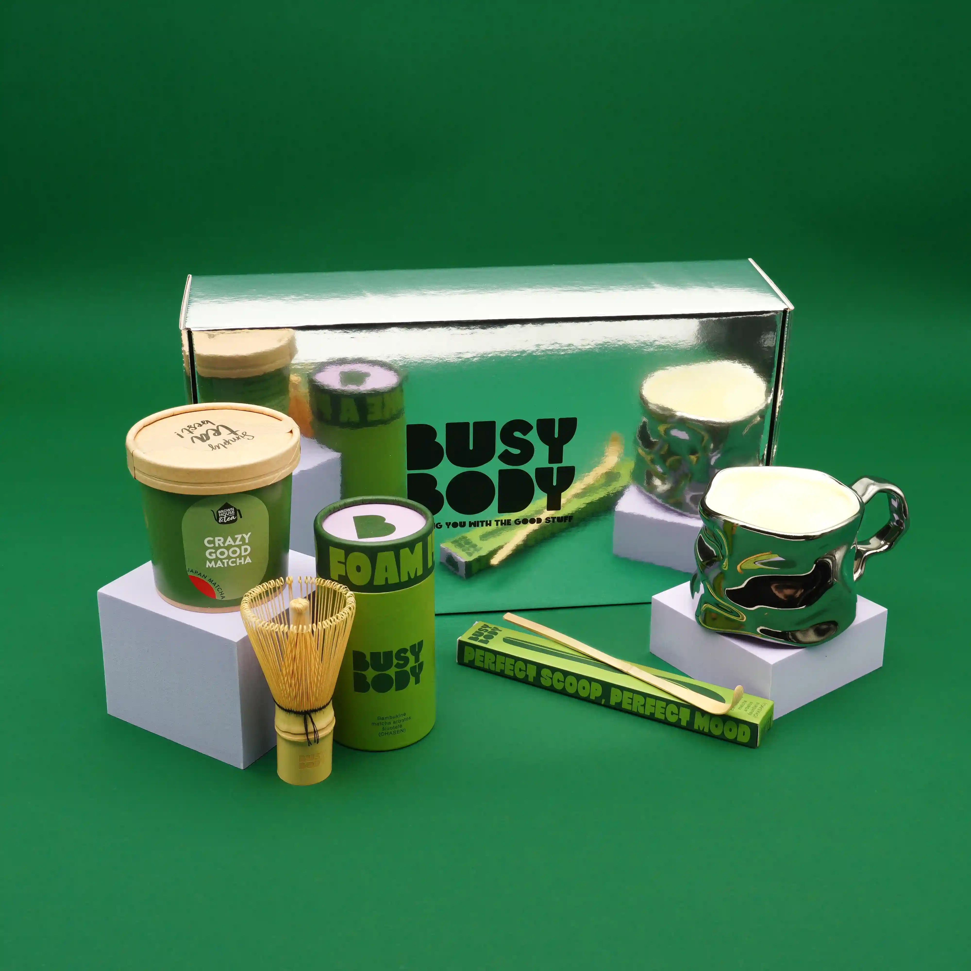 Tai patogus ir modernus matcha arbatos ir aksesuarų rinkinys, kuriame yra viskas, ko reikia skaniai, kokybiškai ir greitai matchai namuose. Prabangus dizainas, stiprūs skoniai ir Busy Body energija. Supakuota metallic dovanų dėžutėje ir paruošta dovanoti.